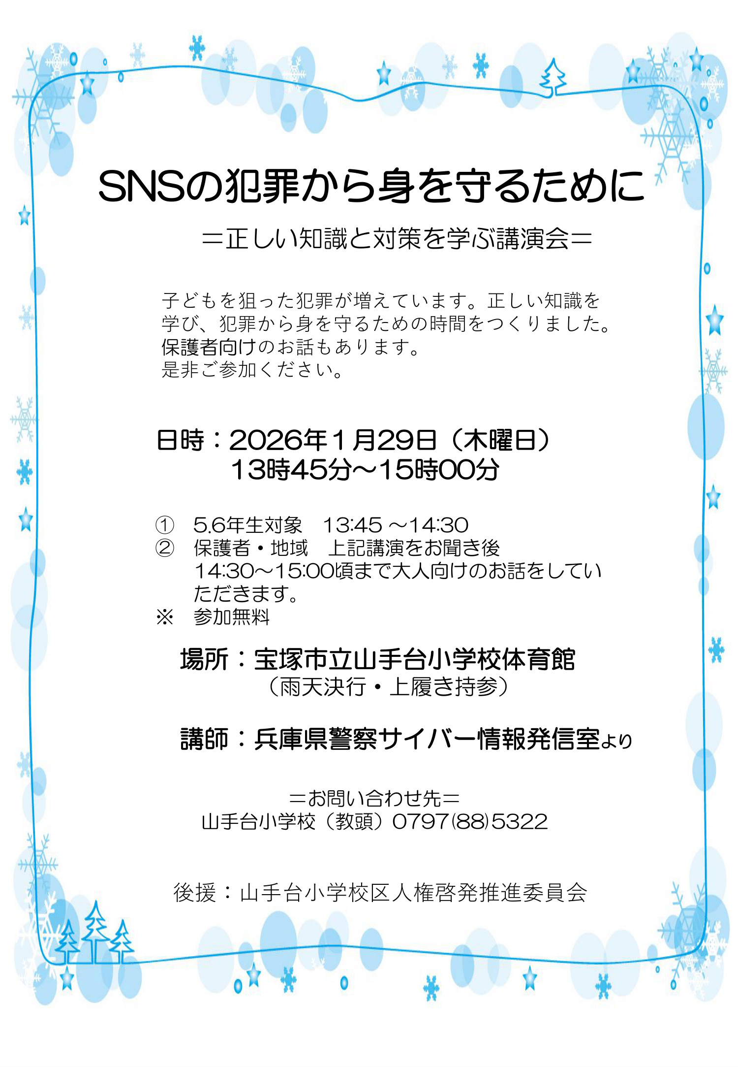 カテゴリー: General SNS犯罪から身を守る講演 SNS犯罪から身を守る講演 1:45 PM – 2:45 PM2026年1月29日 山手台小学校場所を表示 iCal Google カレンダー カレンダーを表示