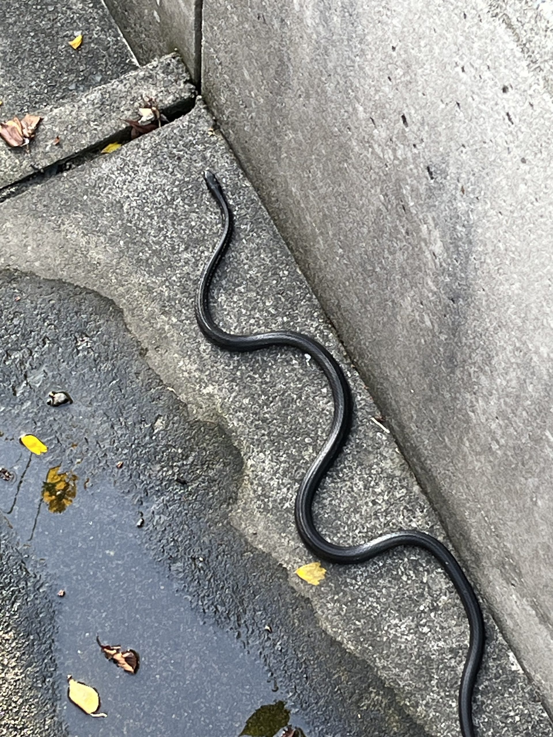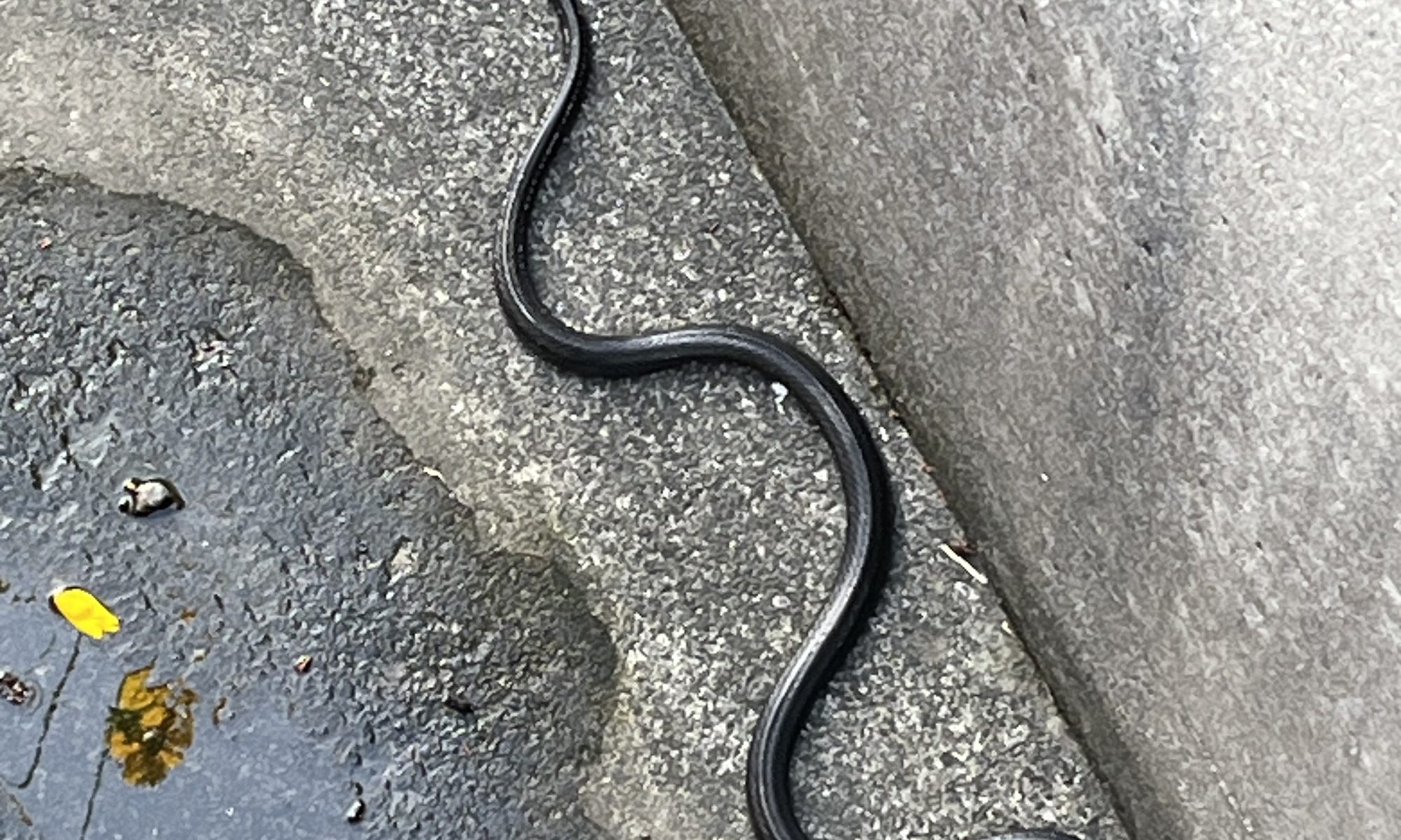 今日、CoKoセンター前の歩道を散歩していましたら、歩道に体長1m程の真っ黒な蛇が行手を塞いでいました。 私が近づくと蛇は逃げて、最後は側溝に落ちましたので写真を撮りました。 家に帰って調べますと、「しま蛇」「ヤマカガシ」「マムシ」の黒化した蛇だそうです。 体型からしてズングリムックリの「マムシ」では無さそうですが、「ヤマカガシ」の毒性は「マムシ」よりも強いとの事で、しかも黒化「ヤマカガシ」は「しま蛇」と見分けがつかないとの事。 いずれにせよ黒蛇には近付かない方がいい様です。 皆さんご注意下さい。