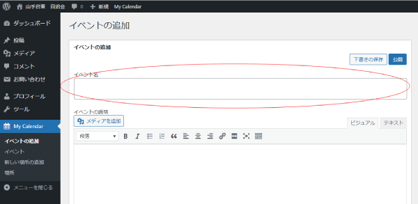 ログインしているときは、次の画面になりますので、タイトルを入力ください。(テニス練習会など)