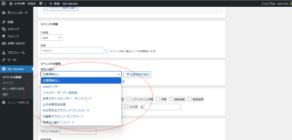 場所がドロップダウンに無いときは 横にある「場所の追加」をクリックして住所を入力ください。