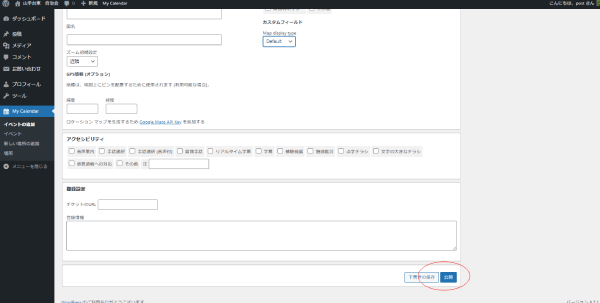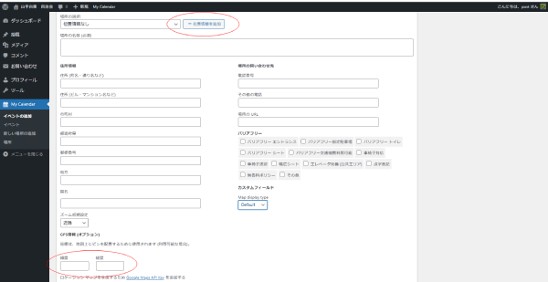 左下にある 緯度 経度 を入力すると、記事を見た人がgooglemapで見ることができ、分かりやすくなります。